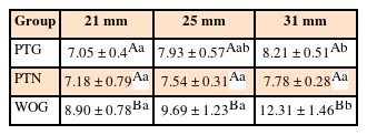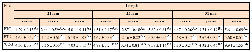 Table 2. When groups with the same length were compared by axis, the 21-mm files showed no significant differences among the 3 systems in the x-axis, significantly greater average vibration acceleration for WOG than for PTN in the y-axis (