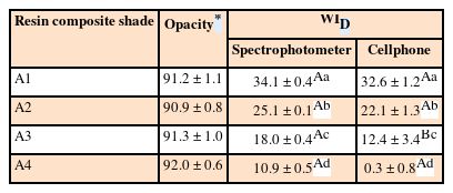D value. Therefore, the differences observed only for shades A3 and A4 were due to higher differences in the coordinates a* and b* (cellphone images were redder and yellower, respectively) in these color shades. However, it is important to emphasize that both methods were able to demonstrate a reduction in WI